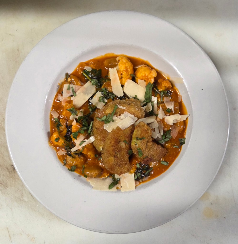 This is the black garlic gnocchi from Blue Stag Saloon. It has cauliflower, gluten-free gnocchi, tomato broth sauce, fennel, kale, garlic, and fried eggplant, and is garnished with grated parmesan and fresh basil.