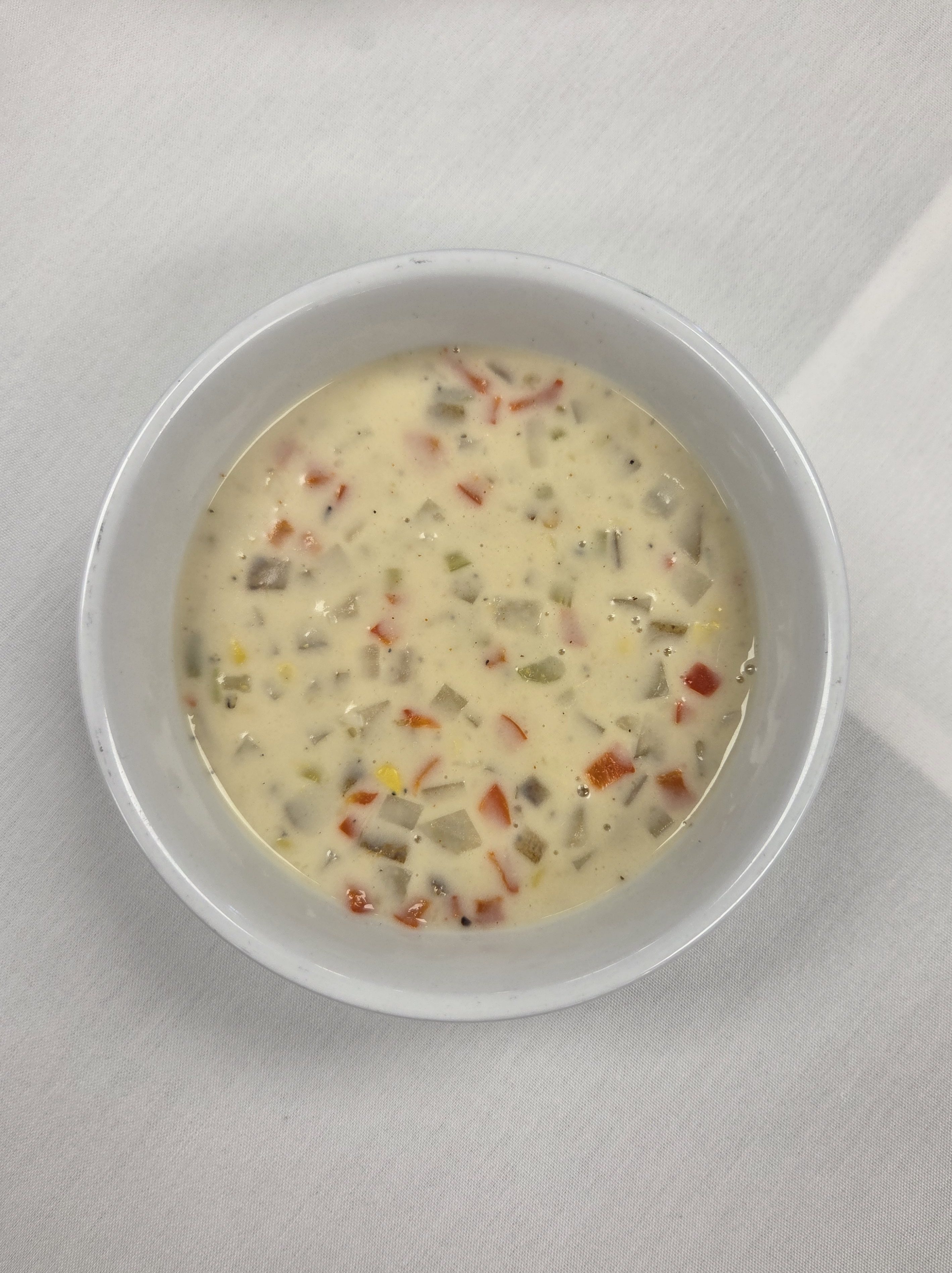 This is my corn chowder with mirepoix, Olathe sweet sweet corn, potatoes, red bell peppers, and hatch green chilies.