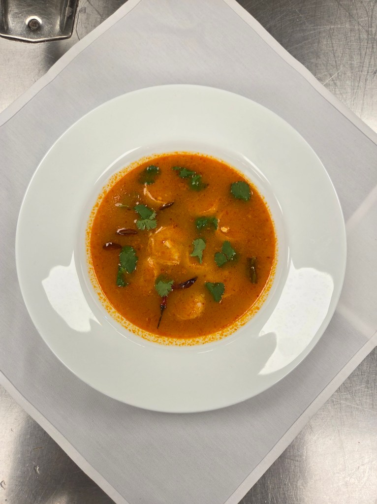 This is my Thai shrimp soup with shrimp, mushrooms, chicken stock, red curry paste, lime juice, lemongrass, fish sauce, Thai chilis, and cilantro.