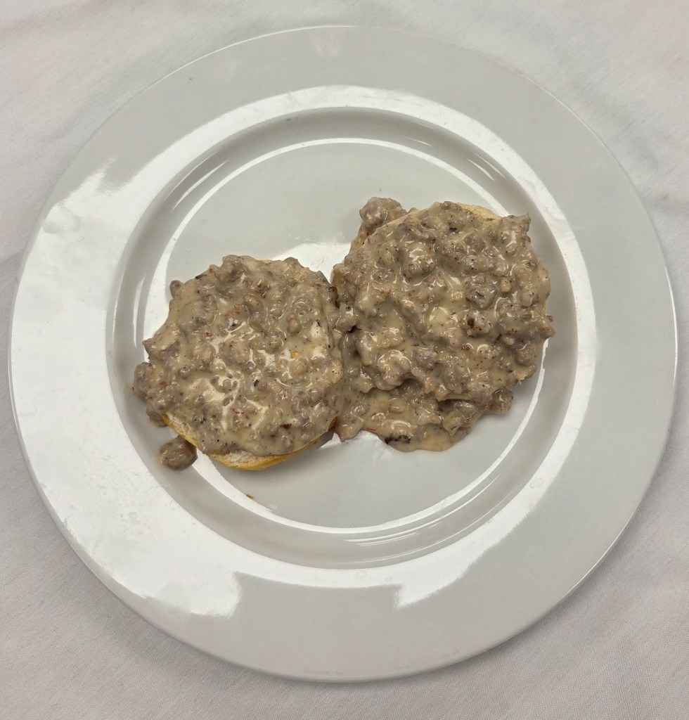 This is a pork gravy made with spicy ground breakfast sausage, milk, and flour.