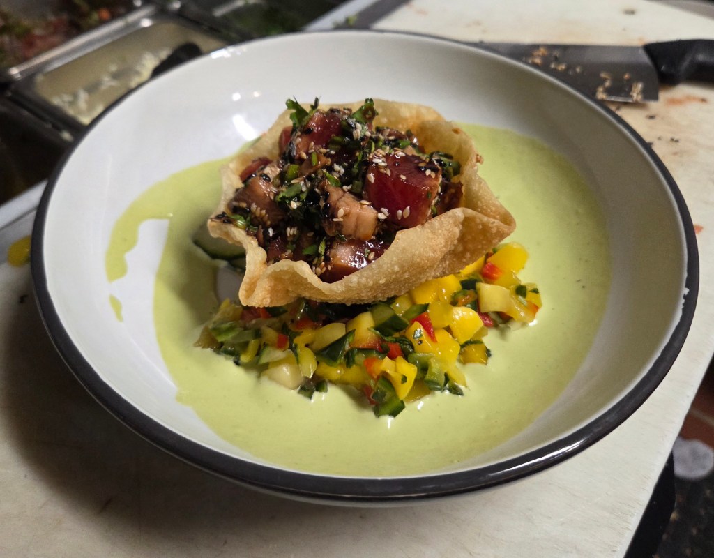 This is a tuna appetizer I plated that has a mango salsa, pickled cucumbers, crispy wonton, seared tuna, ginger soy, and wasabi aioli.