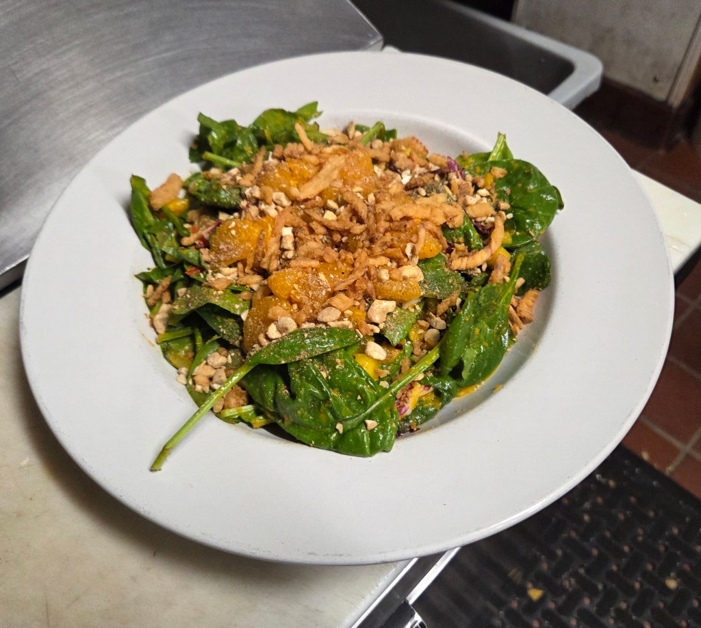 This is a spinach salad I plated that has spinach, radicchio, mango salsa, mandarin oranges, chopped nuts, crispy onions, and a carrot ginger dressing.