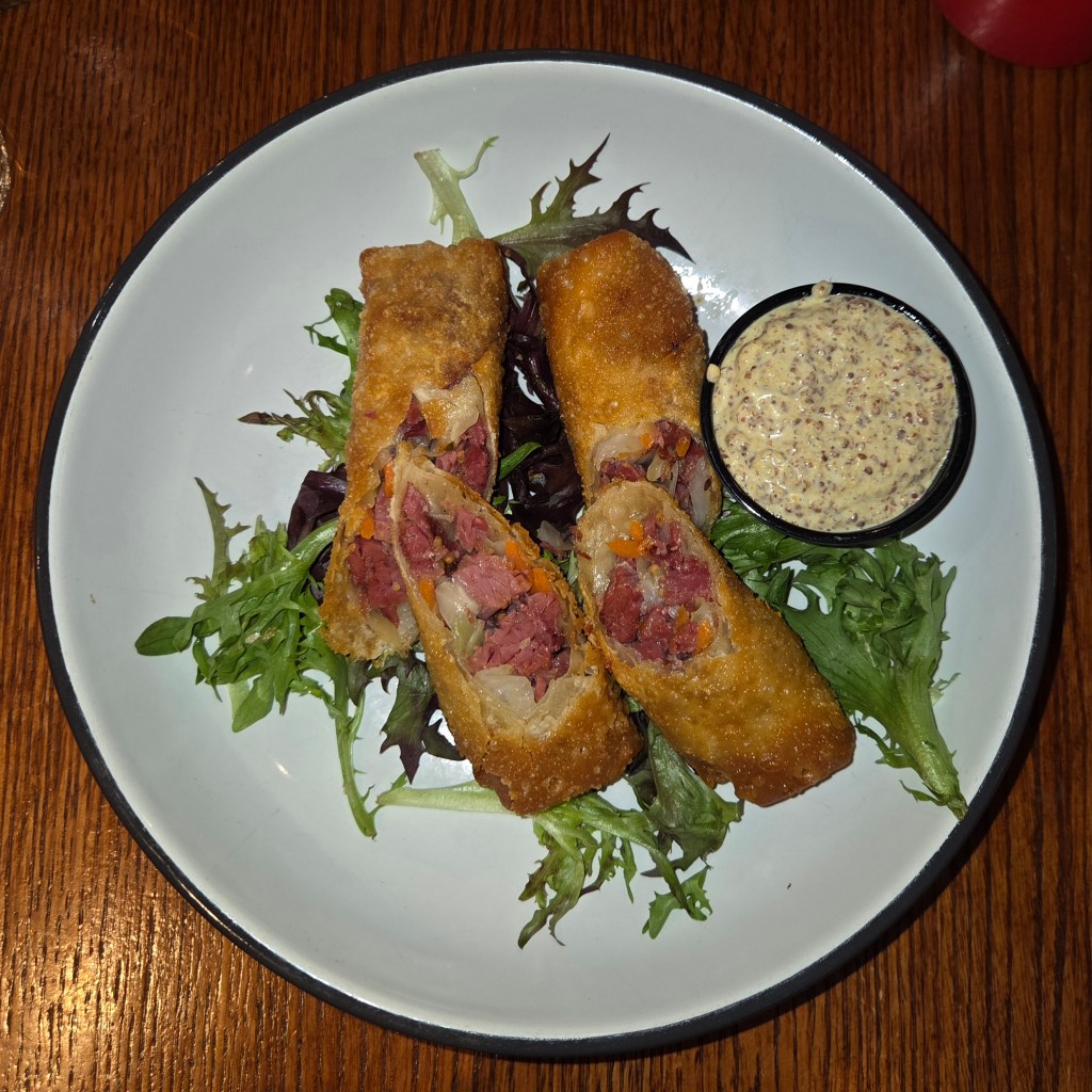 These eggrolls were an appetizer special for St. Patrick’s Day. They contain corned beef brisket, shredded cabbage, and matchstick carrots wrapped in a traditional eggroll wrapper, and are served with a side of our house mustard aioli used in other dishes.