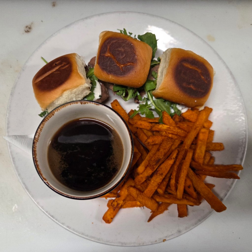 This is a shaved prime-rib french dip with hawaiian sweet rolls, horseradish cream sauce, arugula, au jus, and sweet potato fries.
