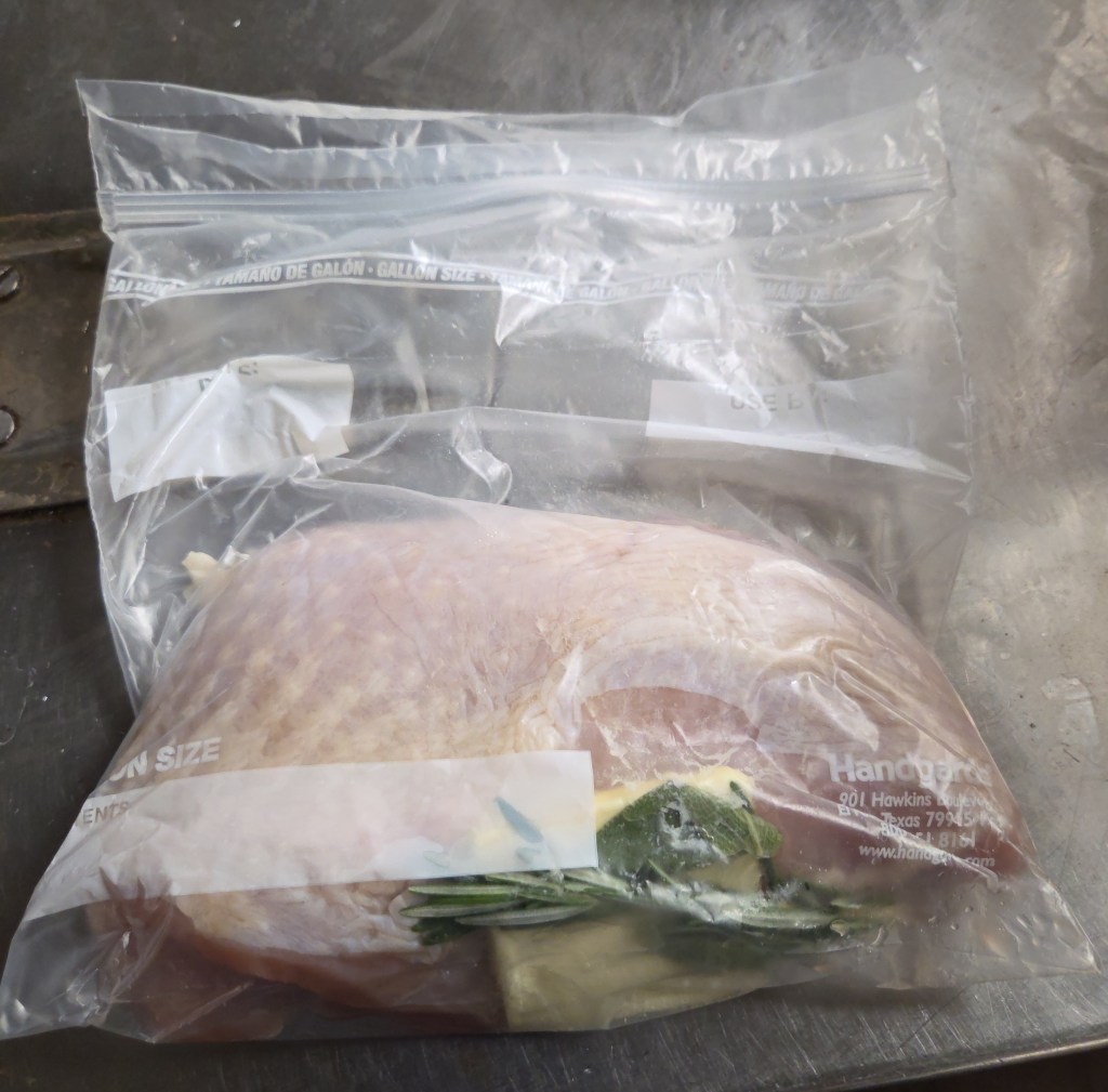 For Thanksgiving, I helped prep the turkey breast sous vides, which were 90 breasts individually portioned into sous vide bags with a tablespoon of butter, three sage leaves, and a sprig of rosemary.