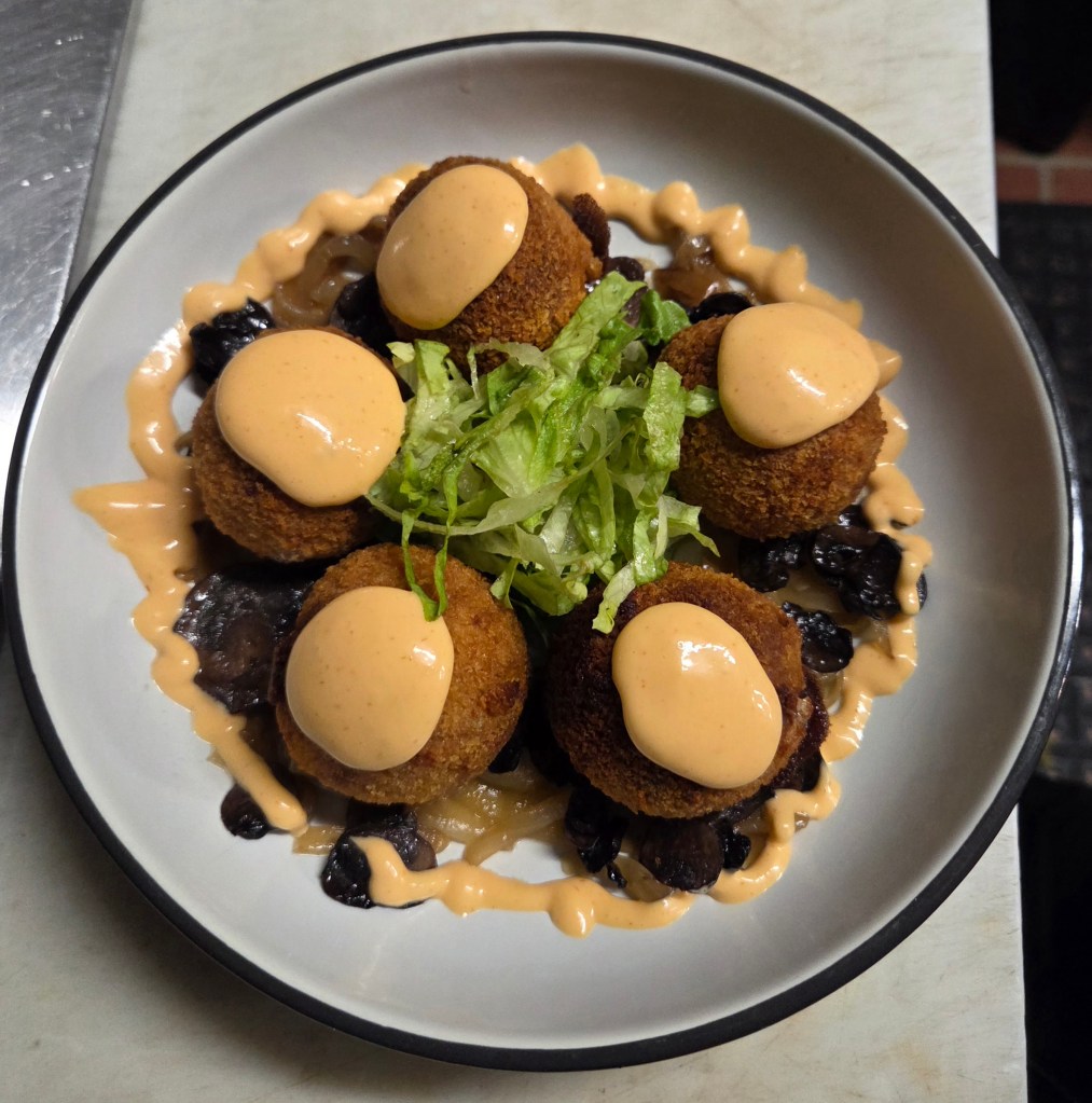 This dish has shaved bison prime rib, couscous, and provolone cheese sauce that are shaped, breaded, and fried, then served over sauteed mushrooms and onions with shredded lettuce and sriracha aioli.